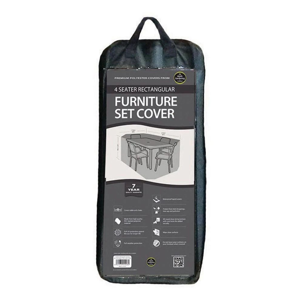 This furniture cover is the perfect way to protect your table and chairs from the elements. A premium furniture cover made for 4 seater rectangular furniture sets, this cover is made from a high quality premium PVC backed polyester material. This cover comes with a 7 year warranty. The dimensions of this cover are: Long 215cm Wide 173cm High 89cm