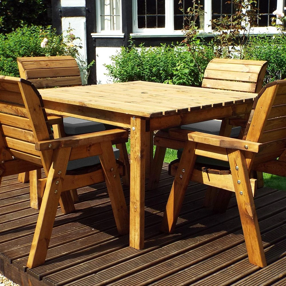 Bring a sense of relaxation to your garden with the Four Seater Square Set from Charles Taylor. Easy to place in a suitable area, this 4 seater set is made from wood which has been sourced with sustainability in mind and hand crafted by experts located at the edge of the Peak District. Within the set, the chairs are created to they can be tucked underneath, so that you can save space when not in use. The furniture has been treated with a commercial oil based preservative, helping to keep your set looking newer for longer, however wood will age naturally over time. Seat pads not included.