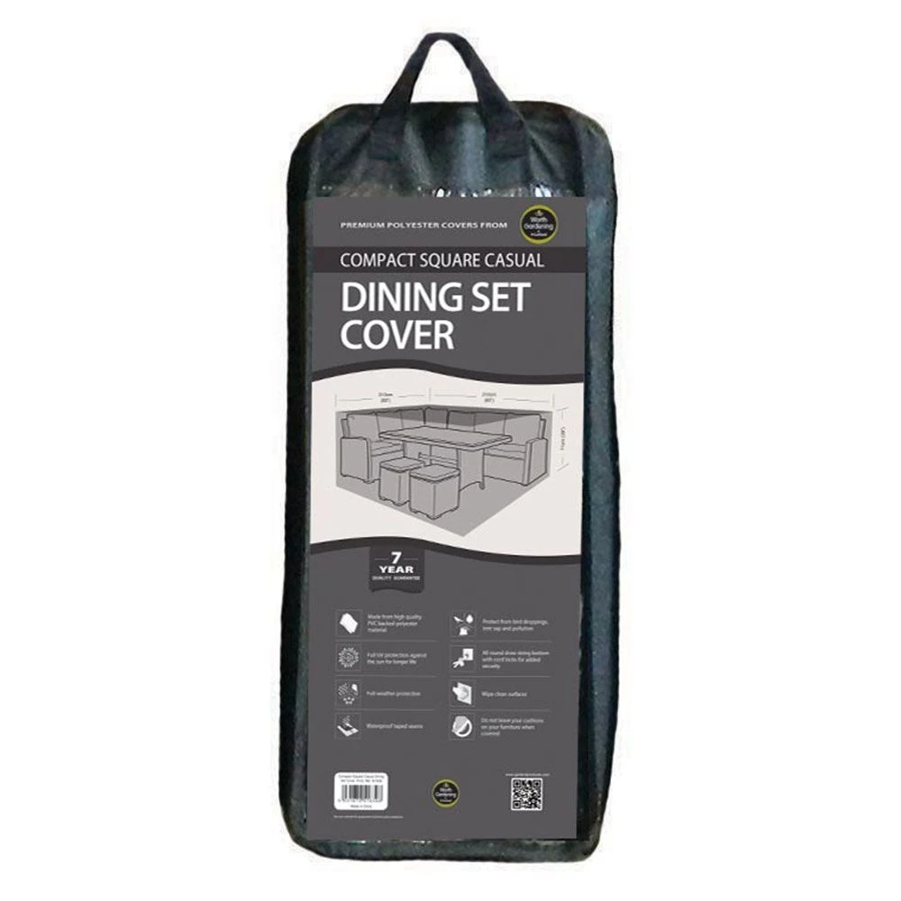 This furniture cover is the perfect way to protect your compact square dining set from the elements. A premium furniture cover made for Compact Square Casual Dining Set, this cover is made from a high quality premium PVC backed polyester material. This cover comes with a 7 year warranty. The dimensions of this cover are: Length 210cm x Width 210cm x Height 71cm.