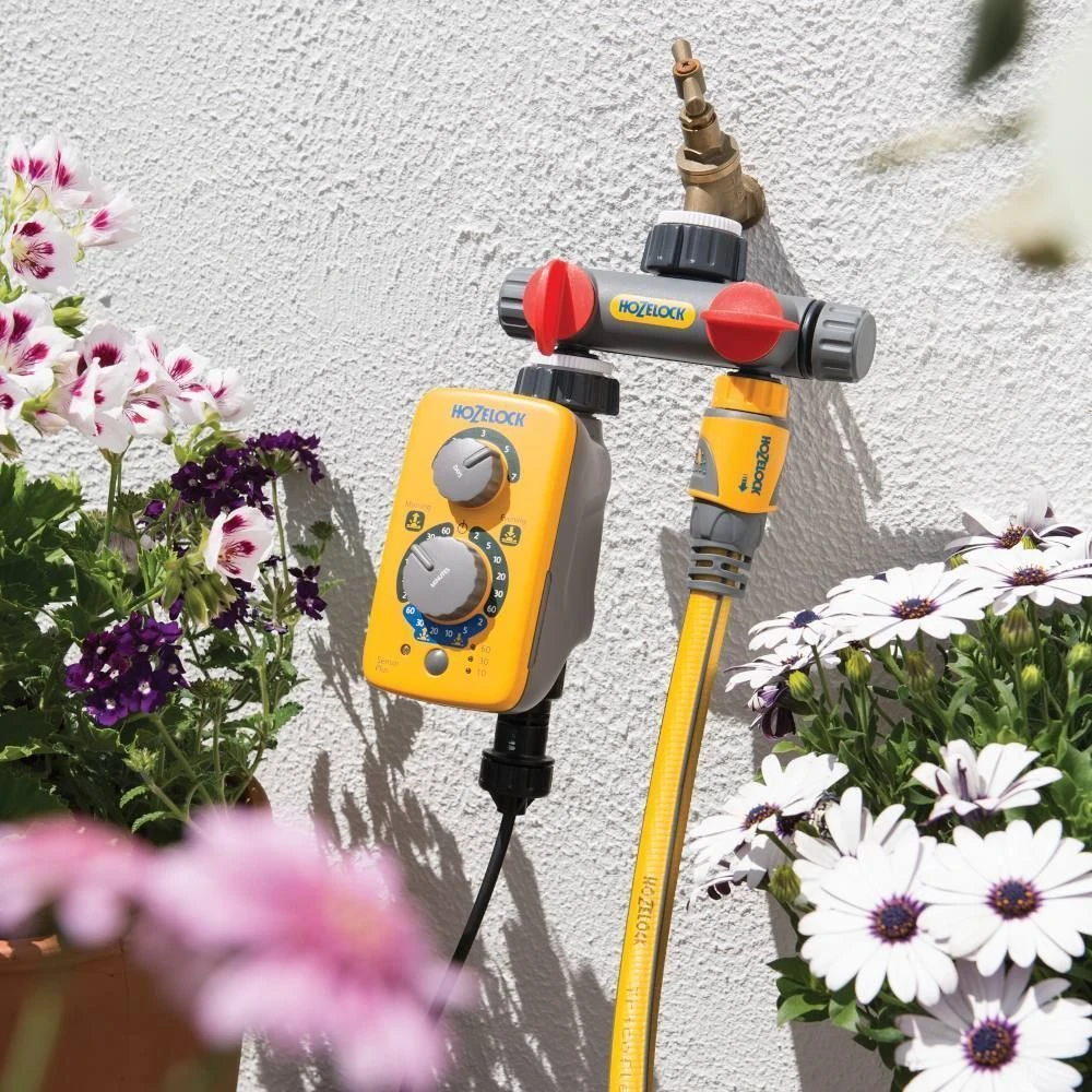 The Hozelock 2-Way Tap Connector turns your normal garden tap into 2 taps, each with their own flow control switch and male connector. This connector connects directly to most garden taps creating a double outlet for hoses, ideal for automatic watering systems as the controller can be screwed directly under the tap. 100% compatible with the Hozelock connect system.