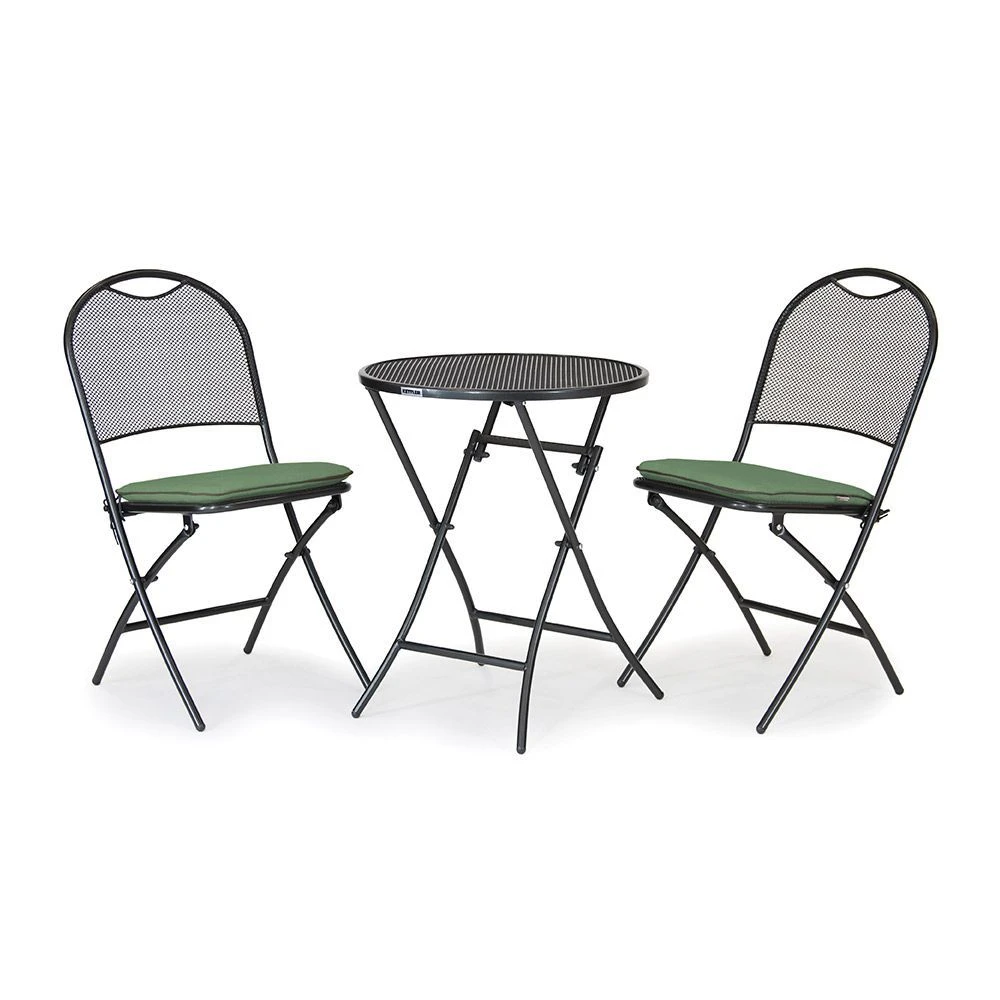 Cafe Napoli sets include 2 mesh garden chairs and a 60cm mesh garden table. Perfect for 2 to sit, relax and have a romantic meal on a balcony or quiet corner of your garden. Fold the table and chairs up and store easily in a small space, ready for next summer. Kettler mesh is treated with the thermoguard plus coating, giving it a tough, all-weather finish. A 5 year anti-rust warranty covers the garden furniture and tailored sage seat pads are available for added comfort. Ideal for a sophisticated lunch with a loved one or a simple cup of tea in the sun, the Caffe Napoli brings Italian style to your garden, balcony or patio.