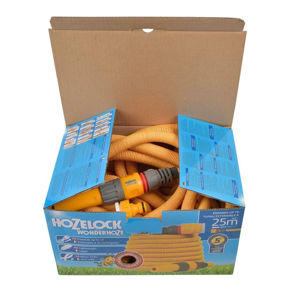 Make your garden watering easy with the Wonderhoze from Hozelock. This lightweight strong fabric hose is easy to carry. The hose starts off contracted together so you can carry the hose to the tap easily. When attached to the tap, the water flows straight through and allows the hose to expand, naturally increasing it’s length by up to 3 times its original size. Because of the nature of this hose, its will never kink and has guaranteed leak free fittings. Perfect if you are looking to start a new garden or replace your existing hose.